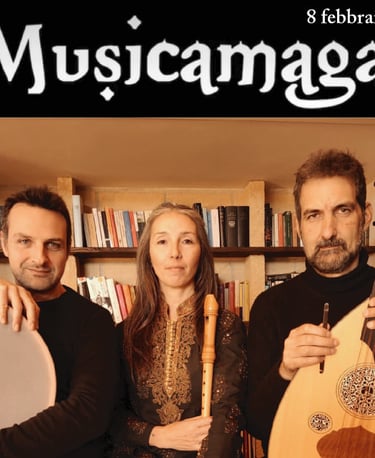 - Musicamaga è l’incontro immaginario tra due musicisti arabi e una flautista italiana. Lei li scruta, legge, accoglie i due musicisti; li ascolta improvvisare ed intrecciare melodie su modi musicali che chiamano MAQAM. Il suonatore di Oud ed il Percussionista si accordano al suo flauto. Lei ferma si ferma per un attimo chiude gli occhi, ascolta, riconosce, impara ad improvvisare con loro. Tutta questa musica, la loro e la sua è come una danza antica che ha tante madri e padri: la Persia, la Grecia, Pitagora, i modi musicali della Tradizione.In quel tempo la musica era epica e potente, le note emergevano solitarie o in piccoli gruppi da un silenzio profondo e ancestrale e più affilate di una lama, trafiggevano i cuori della gente. Quel tempo, era il tempo della musica maga. Flauti, oud e percussioni ci accompagnano in un viaggio nel tempo e nello spazio. Il tempo è il medioevo e lo spazio è quello attraversato dal repertorio di musica antica dell’Europa e dell’impero ottomano in un dialogo senza tempo tra due culture che non hanno mai smesso di intrecciare i loro stili. Celebriamo con Trotti e Saltarelli la magia di un’epoca che ci riporta all’infanzia dell’umanità.